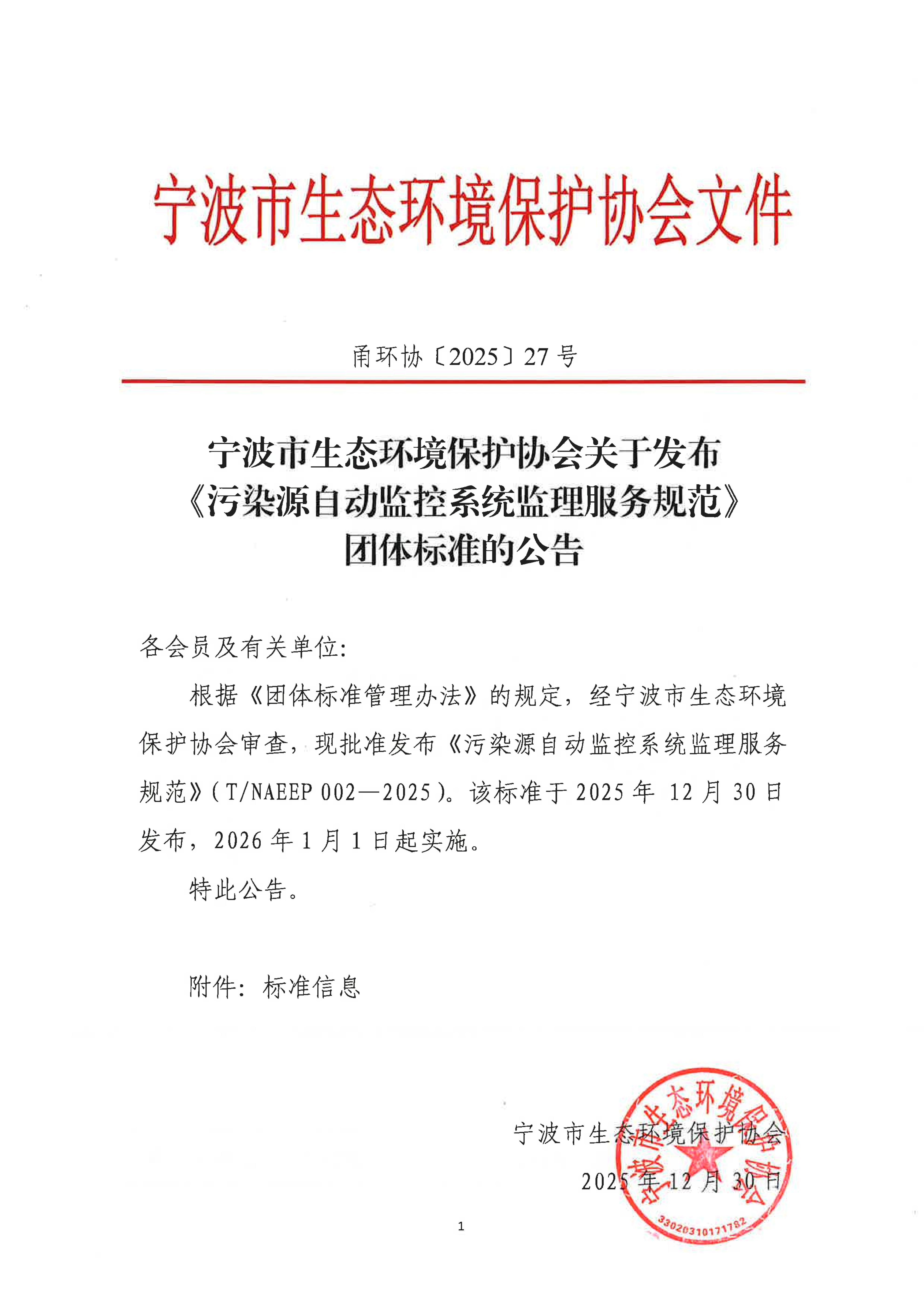 2025(27)--宁波市生态环境保护协会关于发布《污染源自动监控系统监理服务规范》团体标准的公告
